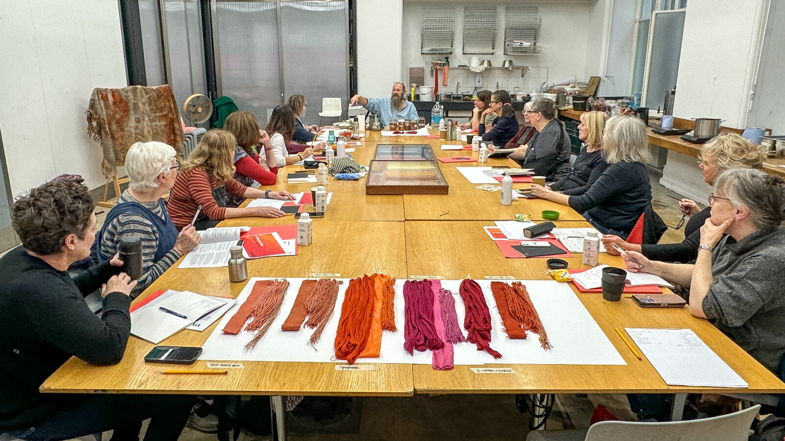 The ‘In Search of Red’ weekend allowed dyers with experience to explore traditional and historic reds, some which are rarely used today. It was a wonderful mix of people, with some returning from our summer courses, some we knew from teaching at Ditchling and some wonderful new faces. It was also a great mix of backgrounds – professors, conservators, farmers, chemists and weavers, and folk who had come from Berlin, the US and even Glasgow!